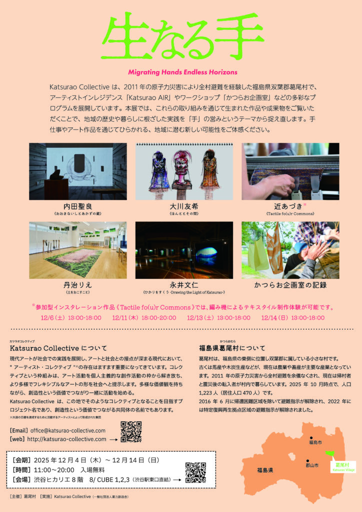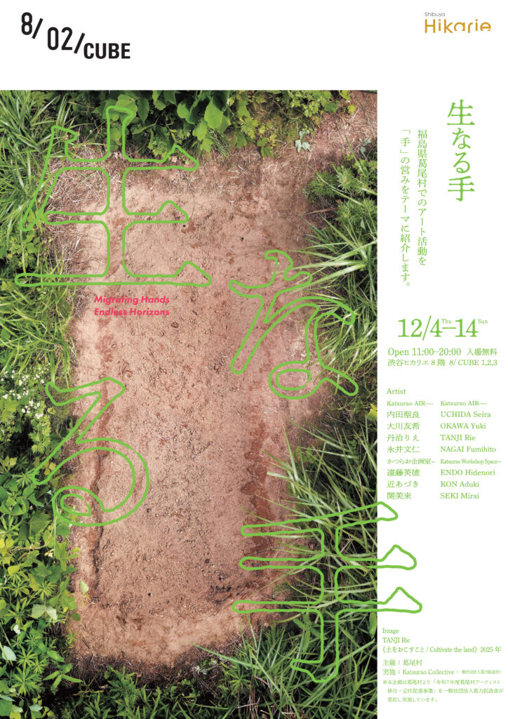 2025年12月4日(木)から14日(日)にかけて、東京都渋谷区の渋谷ヒカリエ 8/ CUBE 1,2,3 にて、葛尾村での現代美術を中心とした様々なアート活動を紹介する展示企画「生なる手」を開催いたします。